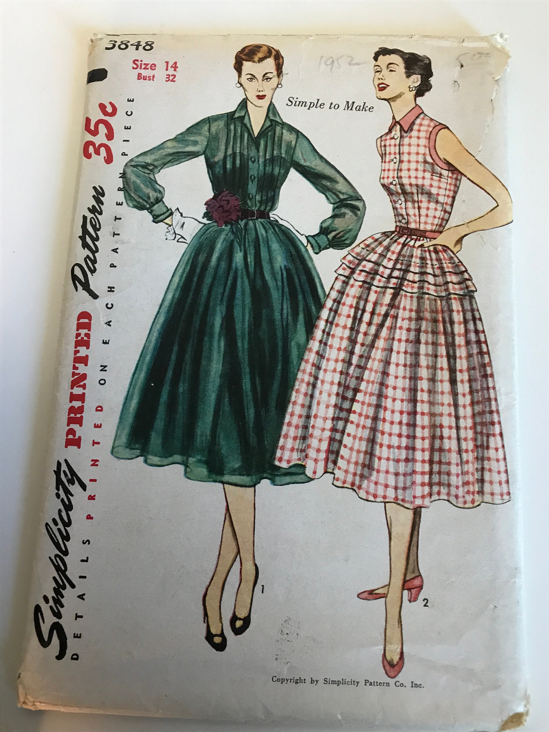 Simplicity Printed Pattern 3848 1952 One Piece Dress Size Etsy